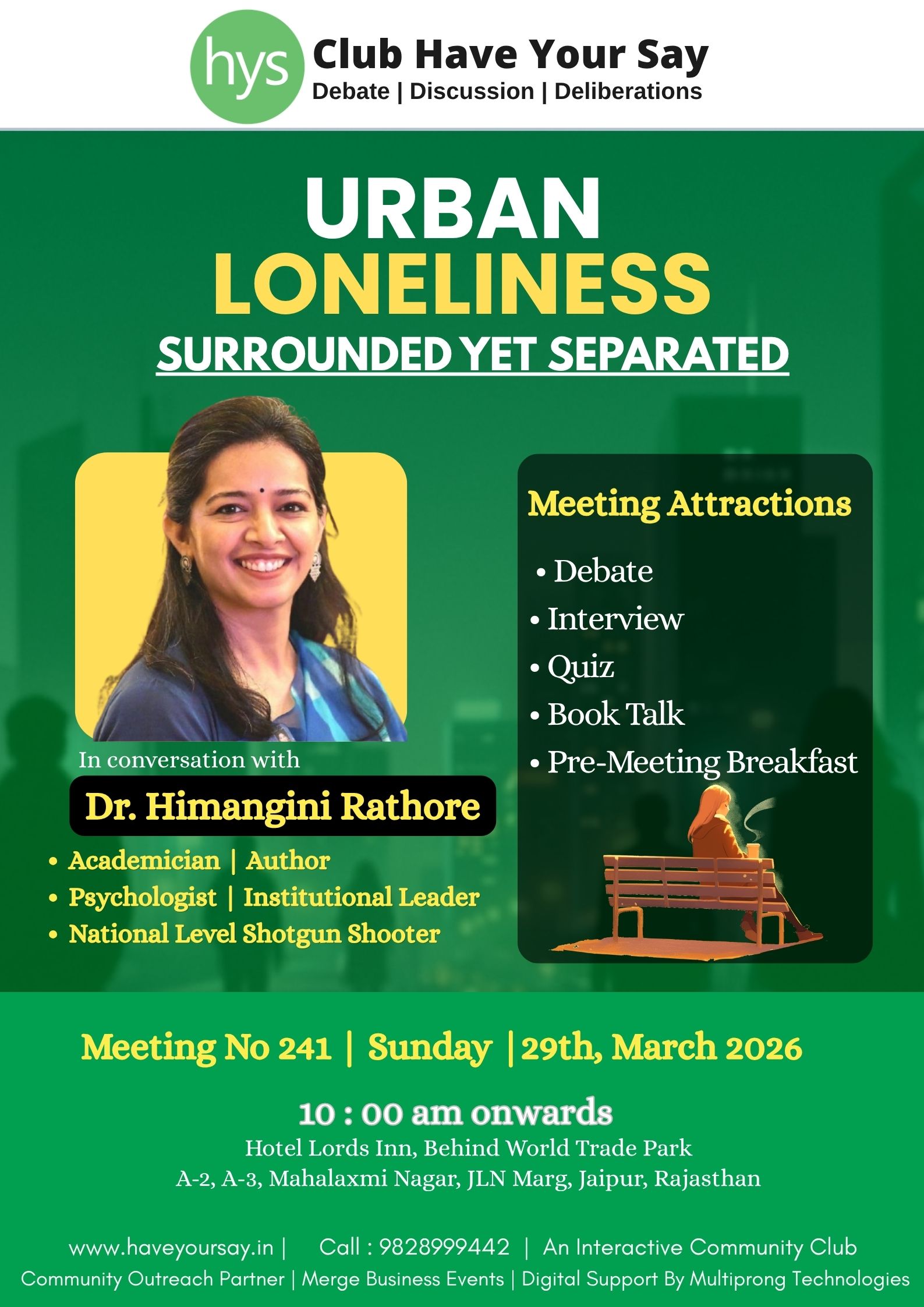 Meeting No 241 | Sunday, March 29, 2026 *Urban Loneliness* _Surrounded Yet Separated_ In conversation with Dr. Himangini Rathore • Academician | Author ✍️ • Psychologist | Institutional Leader • National